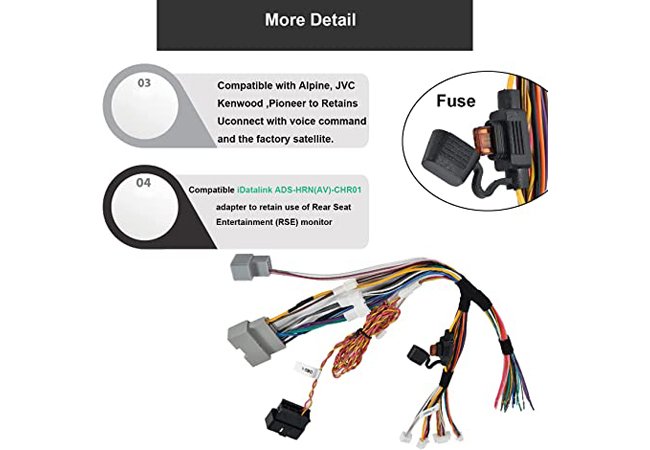Compatible with Alpine, JVC, Kenwood, and Pioneer systems, it allows you to retain Uconnect with voice command and factory satellite functionality. It serves as a replacement for the iDatalink ADS-HRN(AV)-CHR01 adapter, enabling continued use of the Rear Seat Entertainment (RSE) monitor.
