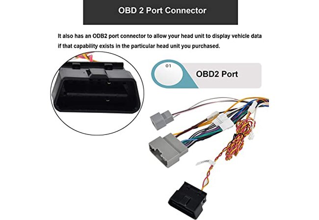 It features an OBD2 port connector, enabling your head unit to display vehicle data if your specific head unit is equipped with this capability.